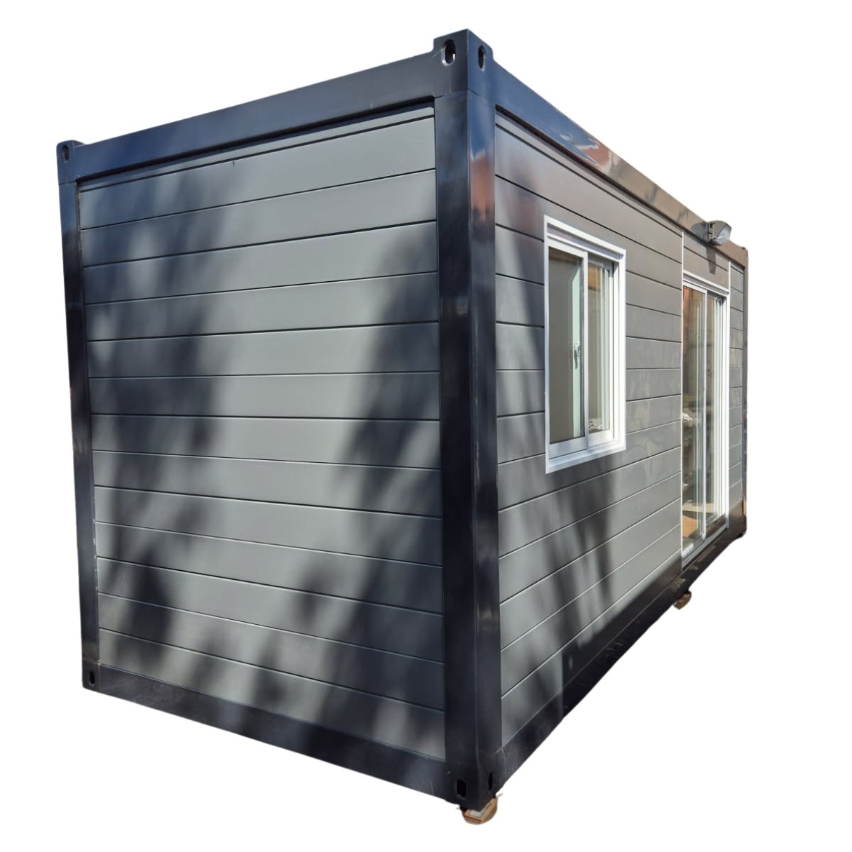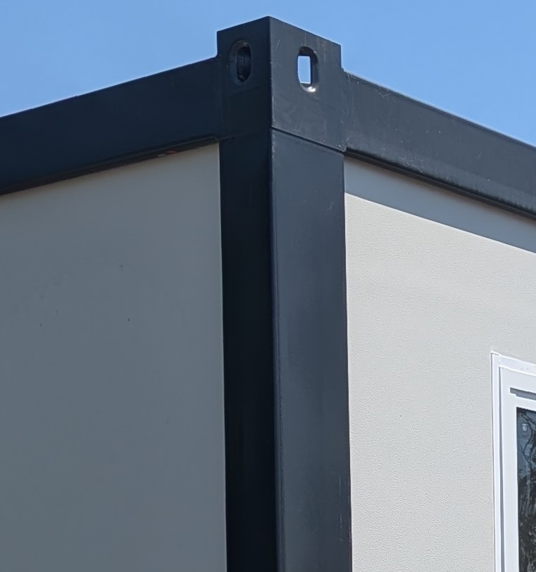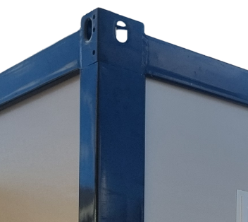 The transportable units are built with a steel frame in a similar footprint to a 20ft container. A 3mm steel is robust enough to move the unit around, and to stack 2 high, and light enough to be practical for transporting. They are galvanised and the roof is clad in steel sheet and there is a very smart design internal guttering system that ensures the unit is highly resistant to water. Galvanising and high performance paint ensure a long life with limited rust to deal with. They are not designed as the same strength as a full 20ft container, and in situ need to be sited on level surface to ensure they do not twist over time.